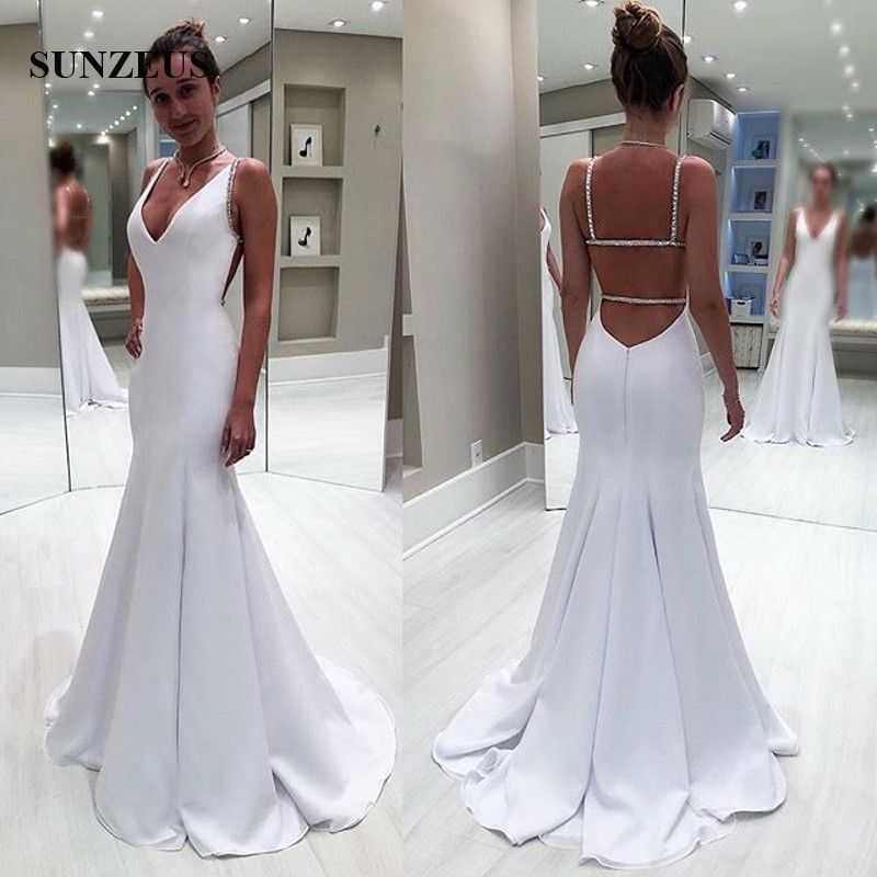 Details About Mermaid Trumpet Bridal Gowns Beaded Crystals White Satin Open Back Wedding Dress