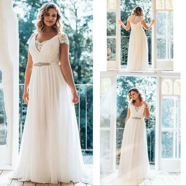 Discount Plus Size Wedding Dresses V Neck Short Sleeve Brush Chiffon Train Illusion Back Beaded Sash Waist Summer Wedding Dress Simple Wedding Gowns